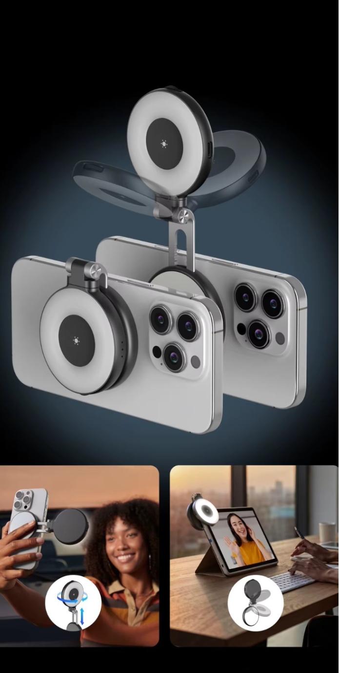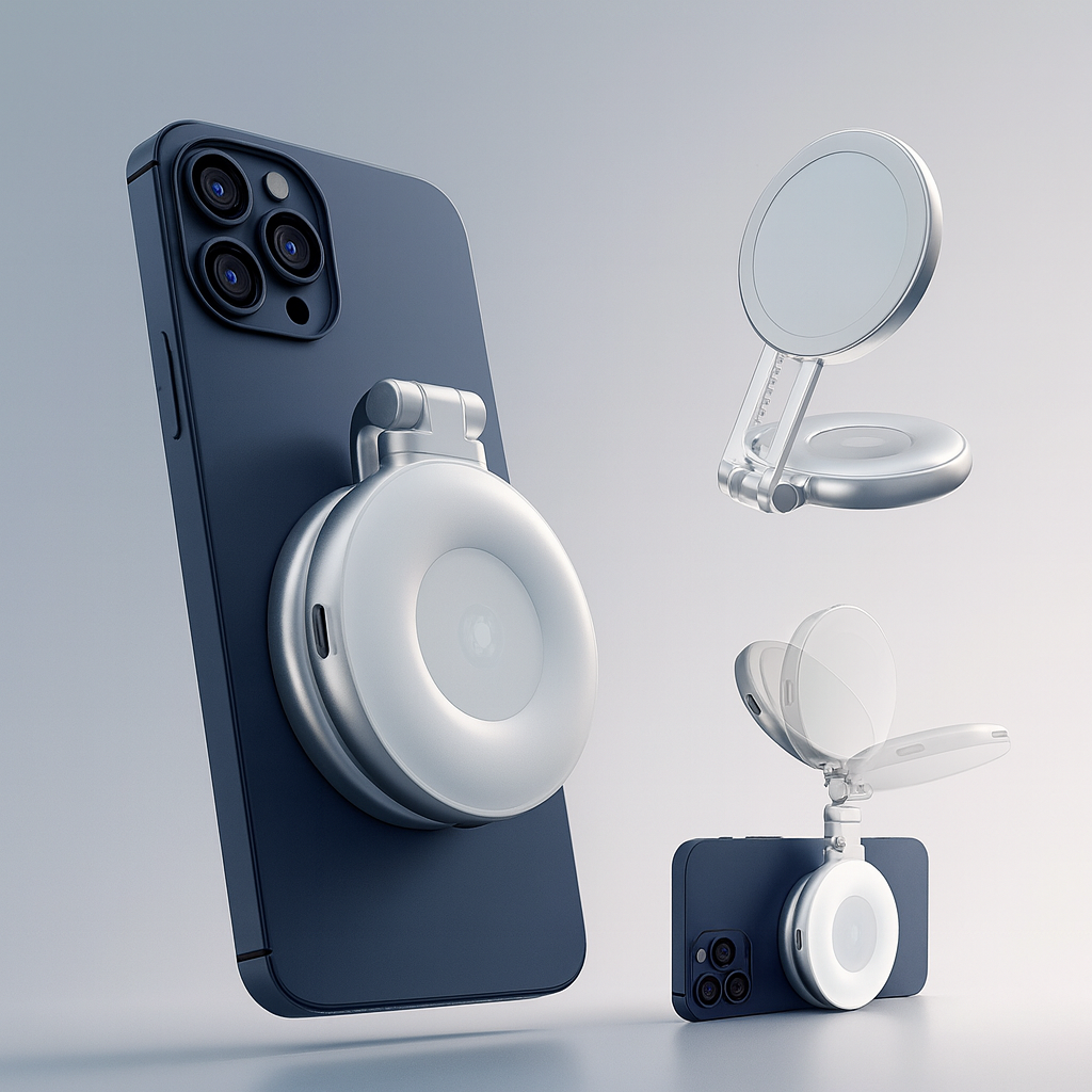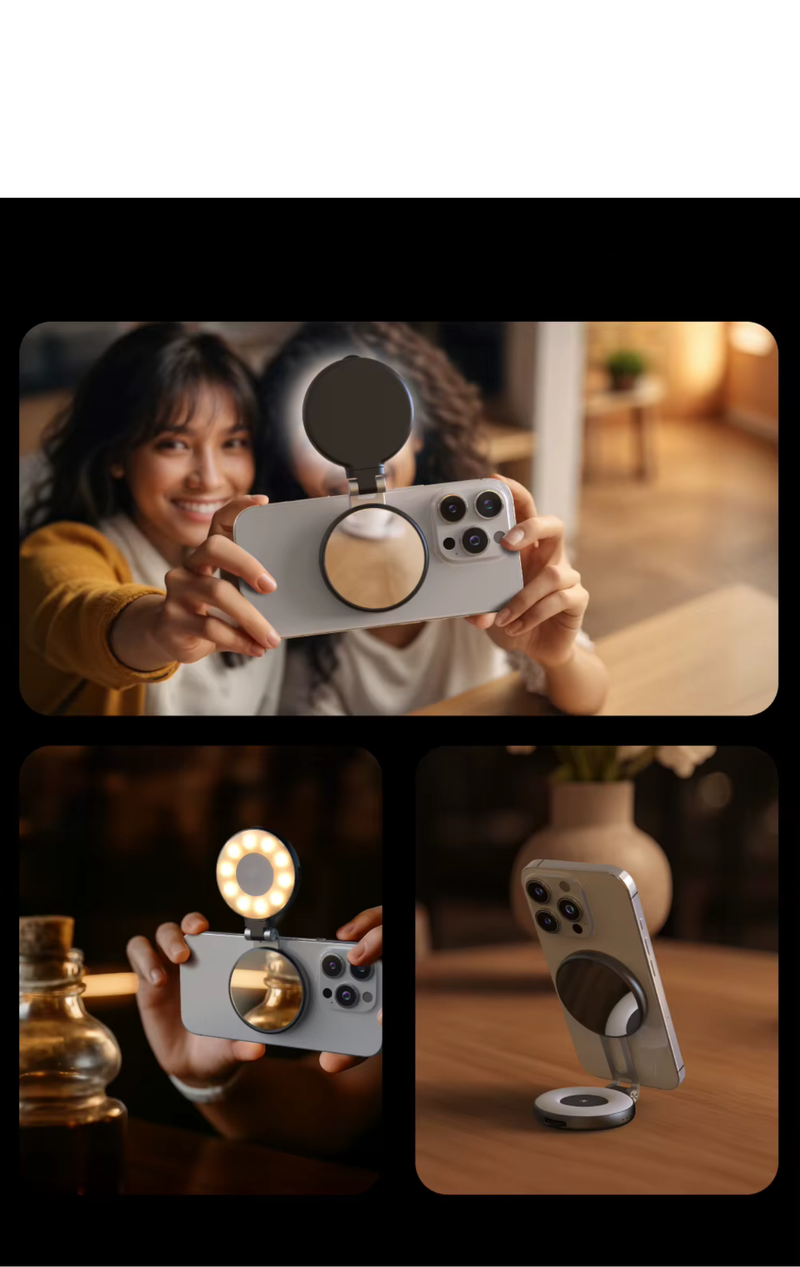 Kompaktowa, magnetyczna lampa z lusterkiem, która natychmiast poprawia jakość zdjęć i nagrań — zawsze i wszędzie.